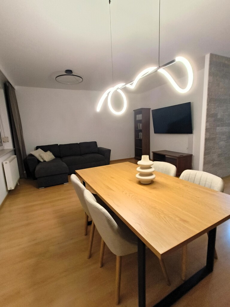 - Przestronny salon z aneksem kuchennym – jasna i ustawna przestrzeń dzienna, idealna do wypoczynku oraz wspólnego spędzania czasu.