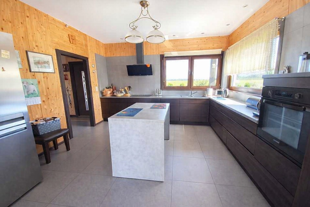 -Kuchnia (17 m²), częściowo otwarta na salon, w pełni wyposażona i umeblowana z wyspą
