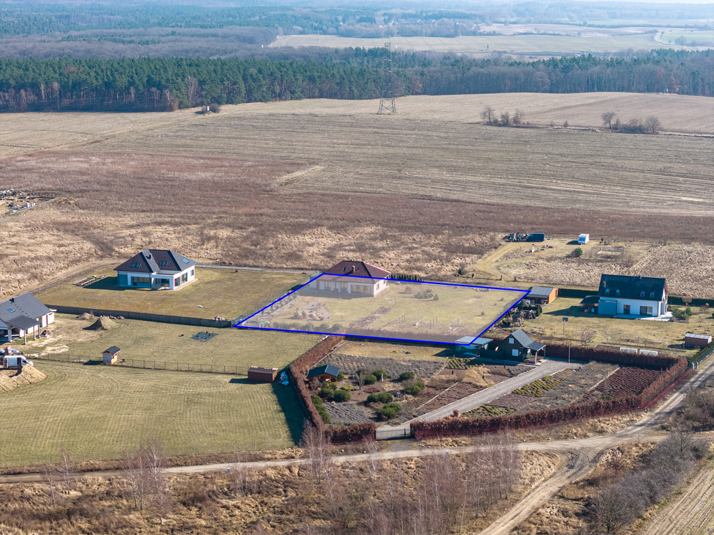 Wyposażenie domu obejmuje ogrzewanie gazowe podłogowe, okna PCV trzyszybowe, dachówkę ceramiczną. Woda z własnego ujęcia, kanalizacja – ekologiczna oczyszczalnia. Działka o powierzchni 3250 m² (w kształcie zbliżonym do kwadratu), ogrodzona, zagospodarowana z możliwością podziału na mniejsze części. Sad owocowy z wieloma drzewami i krzewami owocowymi, ponadto warzywnik ze skrzyniami. Na terenie znajduje się także duży kojec dla psów. Istnieje opcja pozostawienia sprzętu do pielęgnacji ogrodu przez właściciela.