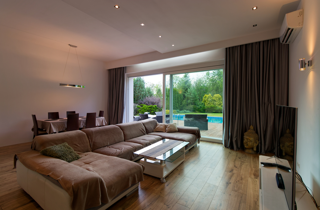 Szerokie, przesuwne okna tarasowe typu HST zapewniają doskonałe doświetlenie wnętrza oraz płynne połączenie salonu z zielonym otoczeniem, prowadzą bezpośrednio na duży taras z murowanym basenem (o wymiarach 9m długość x 4m szerokość i głębokość 1,5 m) oraz piękny kilkunastoletni ogród.