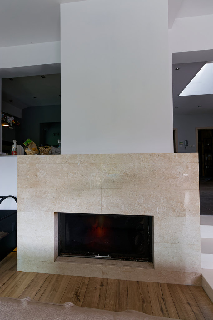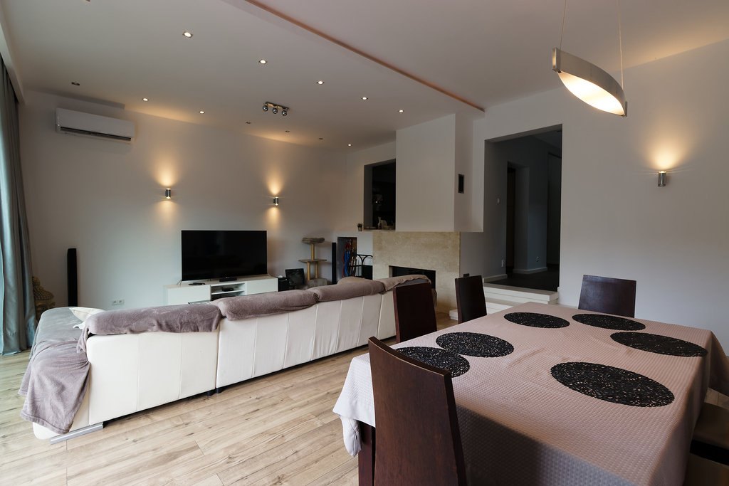 Duża, wygodna kanapa tworzy idealne miejsce do relaksu, a kominek nadaje wnętrzu wyjątkowy klimat i zapewnia ciepło w chłodniejsze dni.