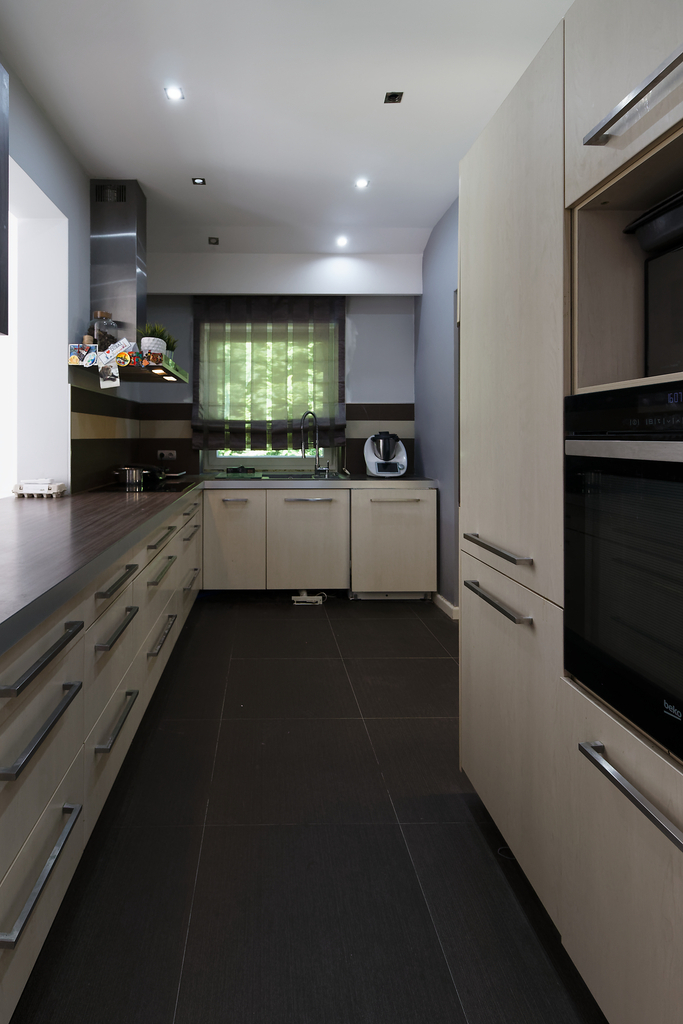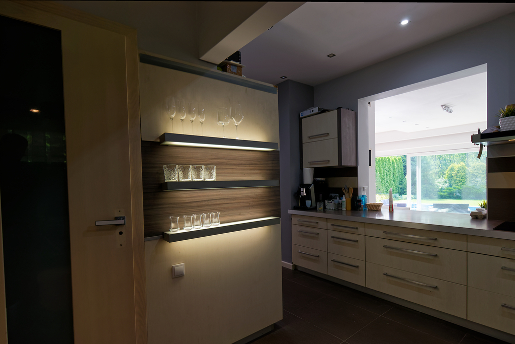 Kuchnia jest w pełni wyposażona w nowoczesny sprzęt AGD: płytę indukcyjną, okap, piekarnik, zmywarkę, kuchenkę mikrofalową, ekspres do kawy oraz ozdobną ściankę z zabudowanym barem.