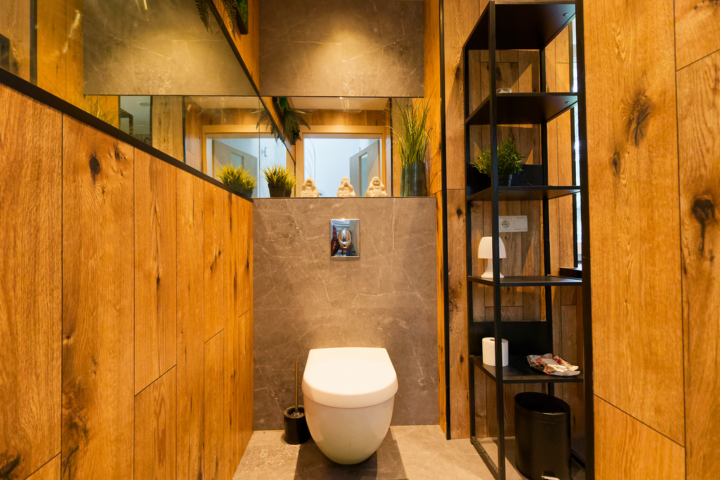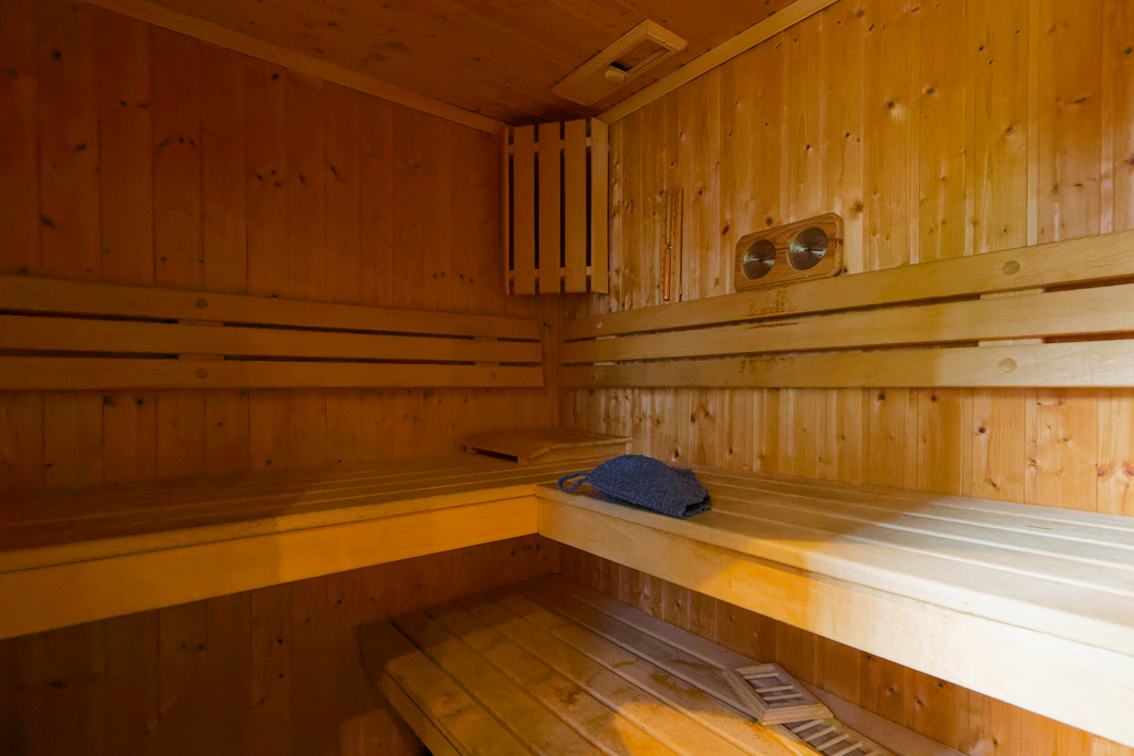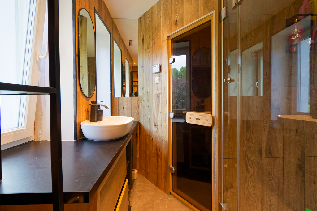 Nowoczesna łazienka z prysznicem i trzyosobową sauną.