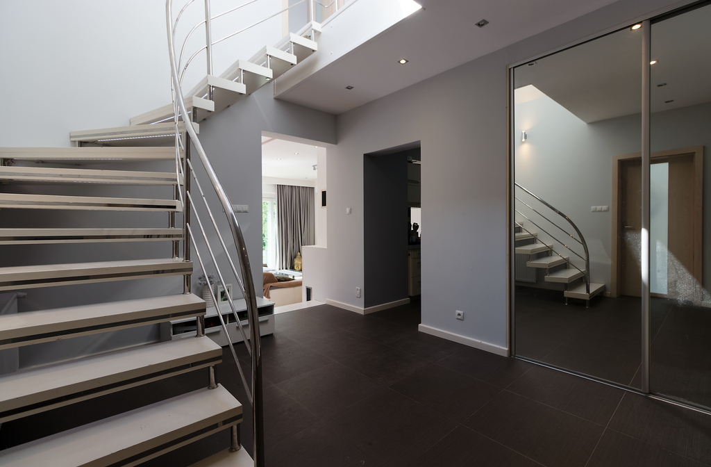 przedpokój z podświetlanymi schodami prowadzącymi na piętro oraz dużą szafą w zabudowie z lustrzanymi frontami, wykonaną na wymiar.