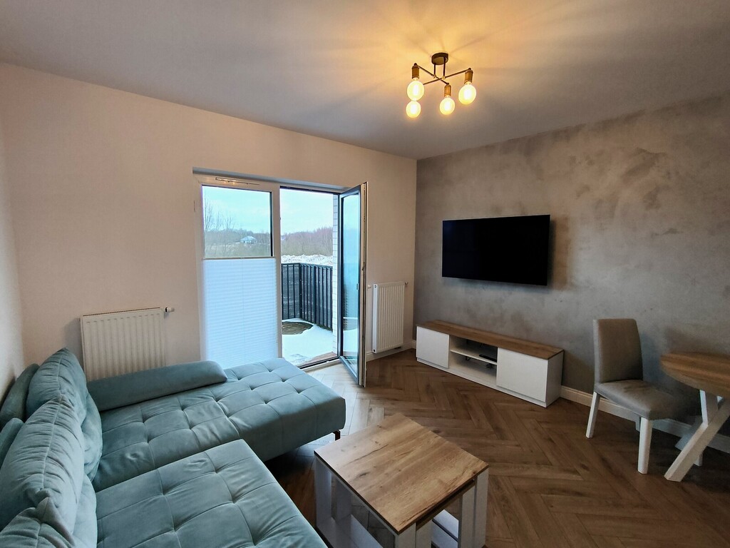 - salon z aneksem kuchennym i wyjściem na duży, ustawny balkon