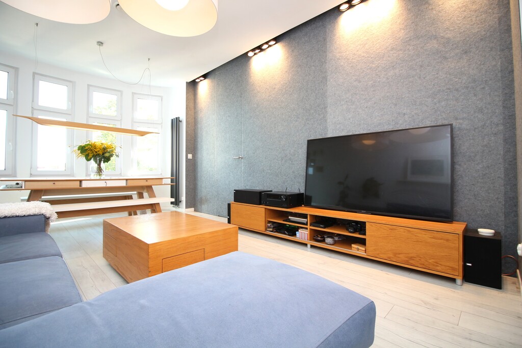 - duży pokój, który został przedzielony ścianką działową, dzięki czemu zyskujemy dodatkową przestrzeń - teraz jest tam strefa sypialni oraz strefa dzienna z tv