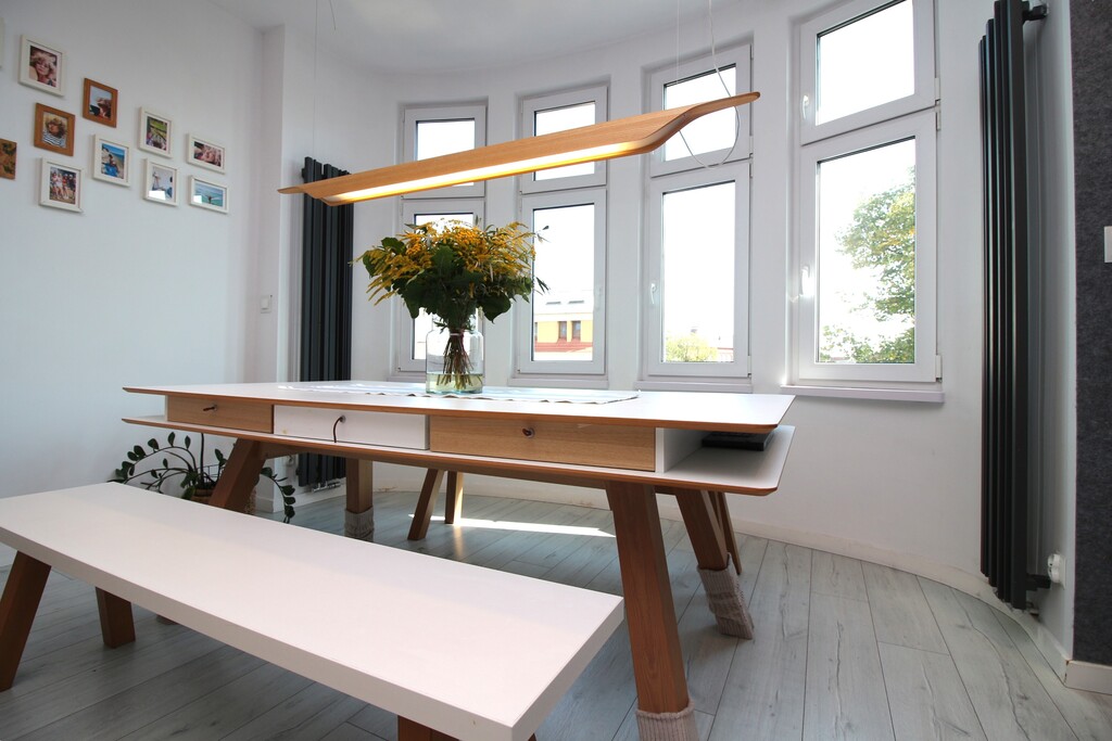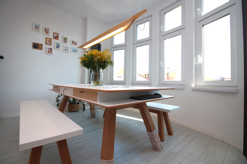 - przestronny widny salon z pięknymi oknami które dają bardzo dużo światła. Wydzielona strefa wypoczynkowa i stół jadalniany.