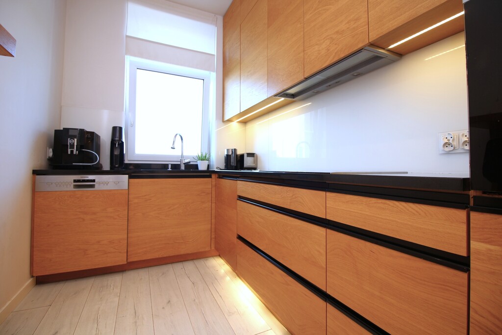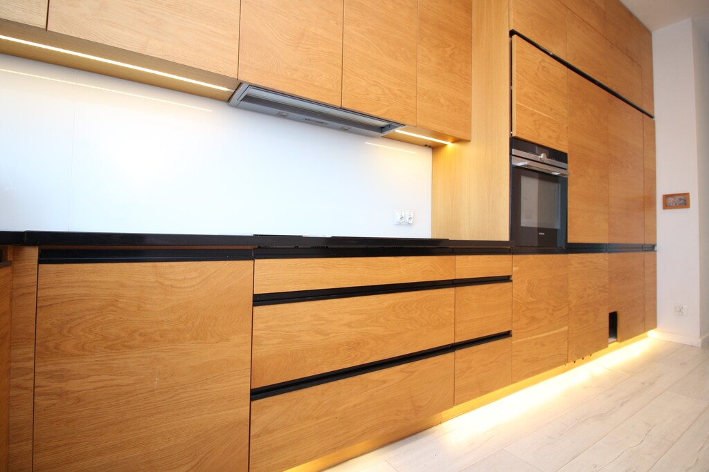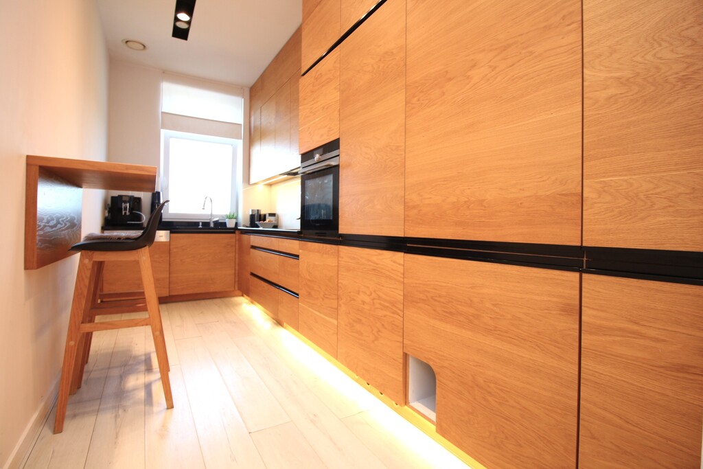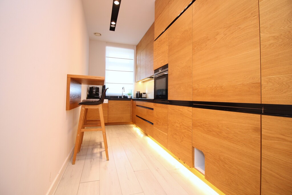 - kuchnia, zaprojektowana na wymiar, z zabudową pod sam sufit oraz sprzętami AGD
