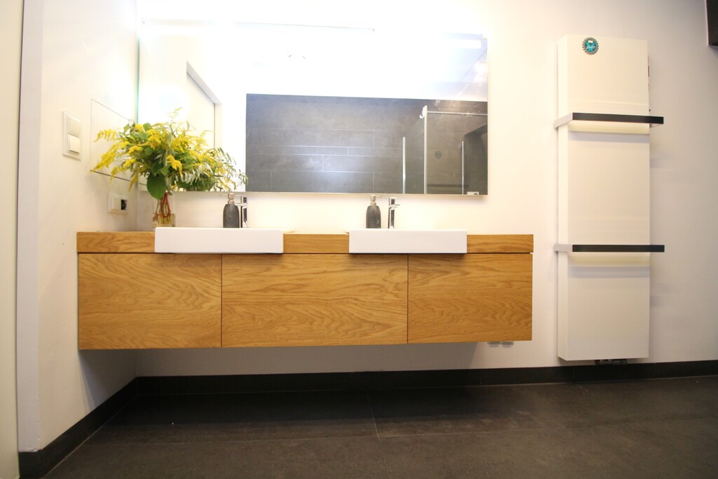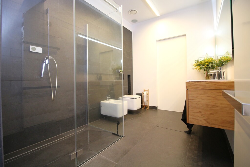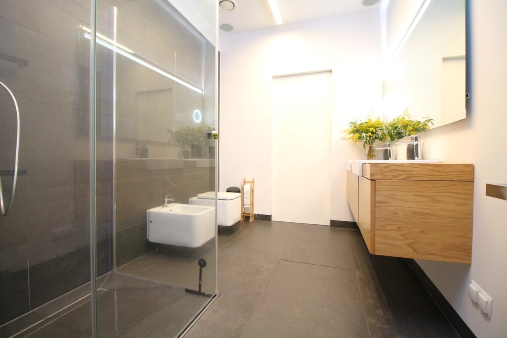 - przestronna łazienka z dużym prysznicem wykonanym na wymiar i dwiema umywalkami. Z łazienki wejście do pralni.
