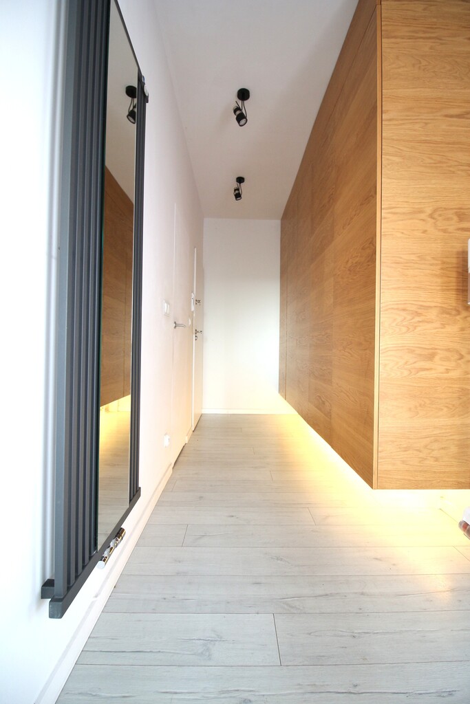 - przedpokój z piękną podświetlaną szafą w zabudowie do samego sufitu