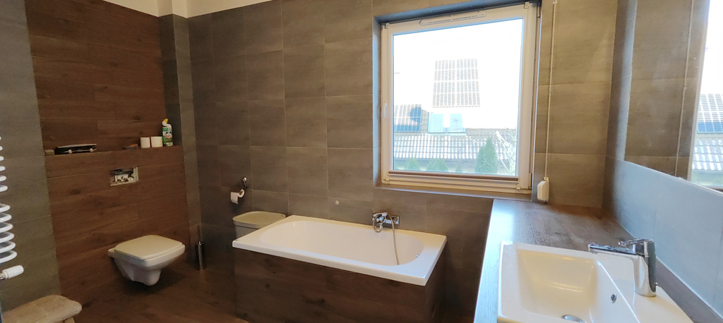 Ogrzewanie i ciepła woda pochodzą z wydajnego, dwuobiegowego pieca gazowego marki Viessman, który jest co roku na bieżąco serwisowany. Na parterze budynku rozprowadzone jest ogrzewanie podłogowe, na piętrze zastosowano je również w łazience, a w pokojach znajdują się grzejniki panelowe.