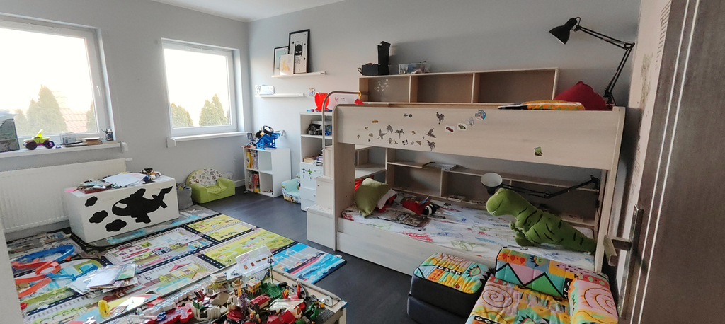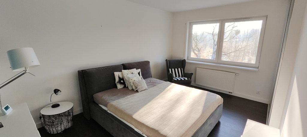 Na piętro prowadzą solidne, wylewane schody, wykończone w podobnym stylu jak podłogi. Przestrzeń, ok. 70m2, podzielona została pomiędzy 3 sypialnie oraz dużą łazienkę z oknem. Największa sypialnia, która stanowi obecnie pokój dziecięcy ma ok. 16m2 i posiada dużą szafę w zabudowie. Dwie pozostałe sypialnie, po również ok. 16m2, to słoneczne pomieszczenia, zbliżone kształtem do kwadratu, co sprawa, że są bardzo ustawne. Duża łazienka o powierzchni ok. 10m2 posiada prysznic, wannę, dużą umywalkę z zabudową meblową i miejscem na pralkę oraz suszarkę. W korytarzu znajduje się wyłaz z rozkładaną drabiną na strych, na którym można przechowywać wiele rzeczy.