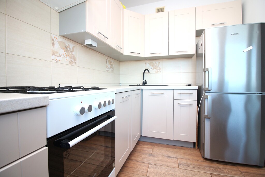 Kuchnia w zabudowie wraz ze sprzętami AGD: lodówka, zamrażarka, kuchenka, płyta gazowa, mikrofalówka.