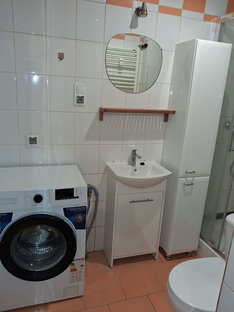 Łazienka - kabina prysznicowa, umywalka, wc, pralka.