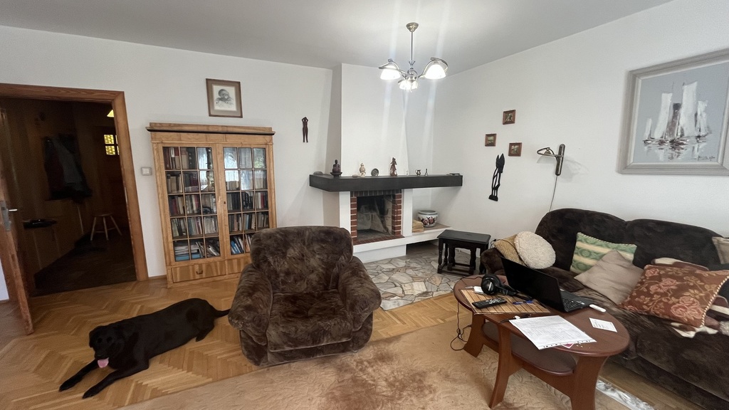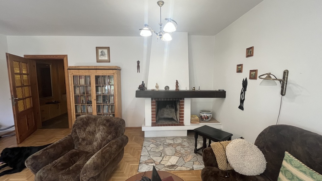 W salonie kominek ,na podłogach parkiet dębowy ,ściany gładzone pomalowane.