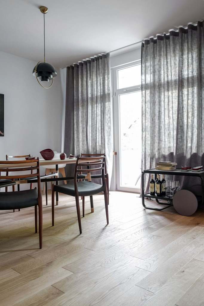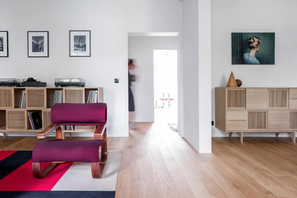 Wnętrze zostało urządzone z dbałością o detale, z wykorzystaniem elementów zaprojektowanych na zamówienie przez Loft Kolasiński, takich jak komody, stoły czy łóżko. Projekt wzbogacają unikatowe meble, oświetlenie i dywany vintage z lat 50., 60. i 70.,