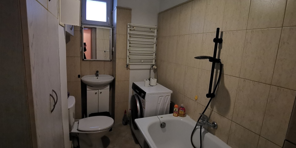 - łazienka z oknem, z wanną, umywalką i wc (płytki i armatura starszego typu)