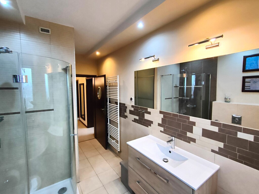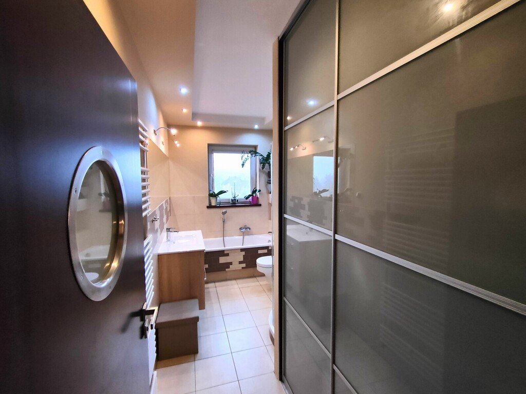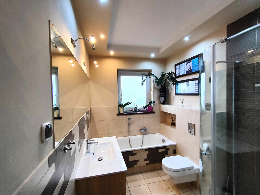 Łazienka została zaprojektowana z myślą o komforcie domowników – znajduje się w niej zarówno wanna, jak i prysznic.