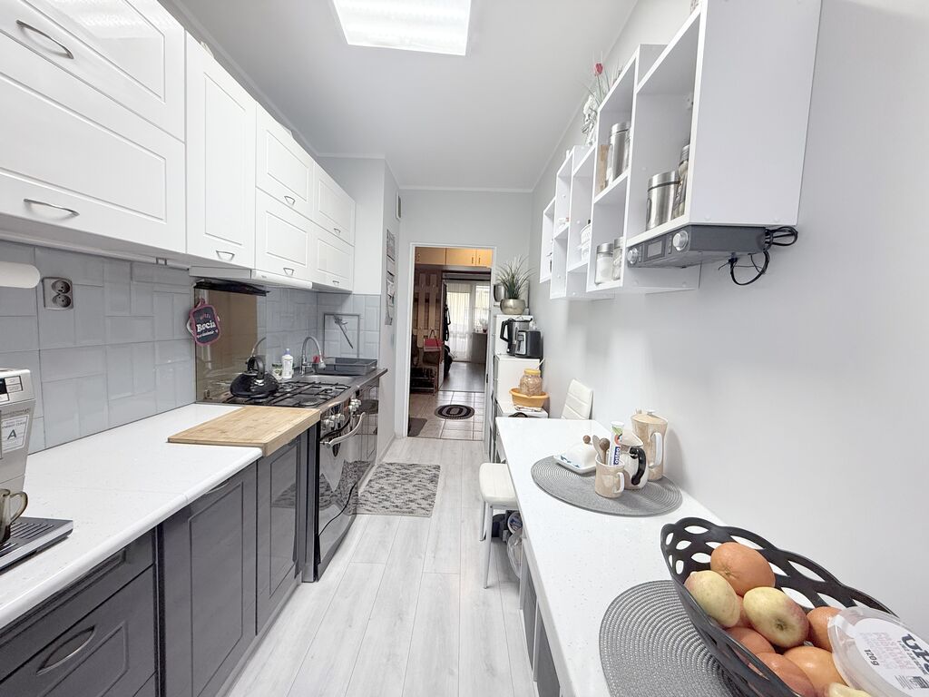 Kuchnia widna, na podłodze panele, na ścianach gładź i pasek glazury między szafkami.