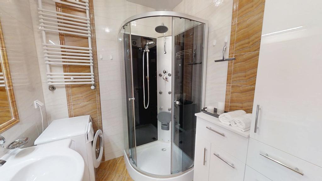 Łazienka w glazurze i terakocie z oświetleniem sufitowym, na wyposażeniu umywalka, podwieszana miska wc oraz kabina prysznicowa z hydromasażem.