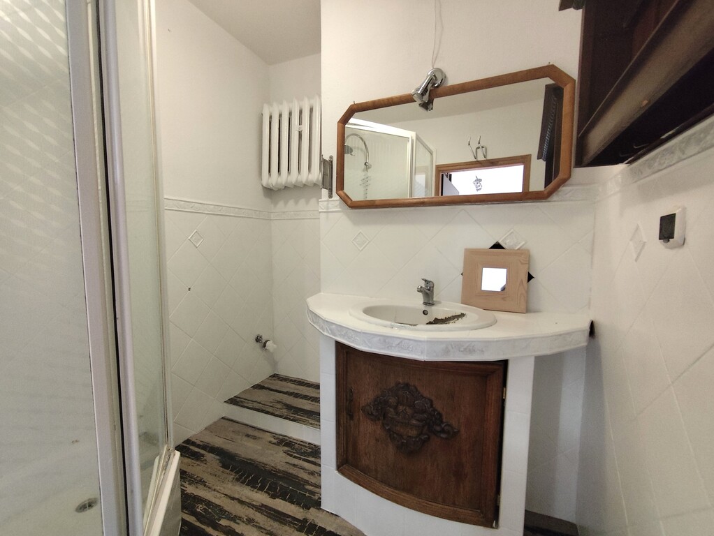 Przedpokój z szafą z lustrem oraz otwarta, klimatyczna kuchnia nadają wnętrzu przestrzeni. Drewniane detale w łazience pasują do obecnego wykończenia kuchni.