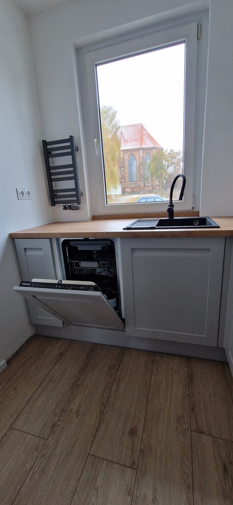 Wysoki parter budynku z 1986 roku. Mieszkanie rozkładowe, wyremontowane z umeblowaną kuchnią i wykończoną łazienką. Pokoje odmalowane, nieumeblowane. Ogrzewanie i ciepła woda z pieca gazowego. Dodatkowo możliwość dogrzewania kominkiem (duża piwnica pod mieszkaniem m.in. na drewno).