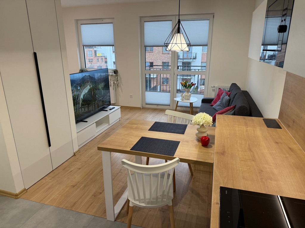 Mieszkanie jest nowe, wykończone w wysokim standardzie i w pełni umeblowane. Dodatkowym atutem jest przestronny balkon, idealny do wypoczynku.