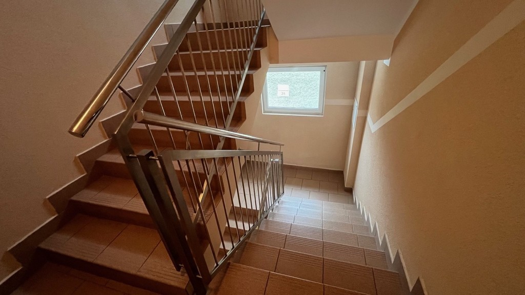 Budynek docieplony z nową elewacją oraz klatką schodową po remoncie.