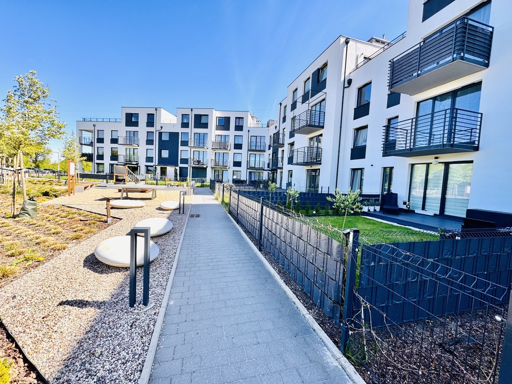 Osiedle z liczną roślinnością, placem zabaw, sklepem "Żabka", oraz miejscami parkingowymi.