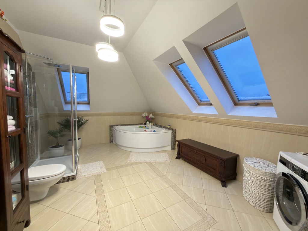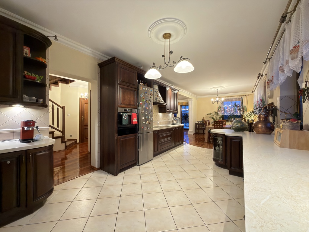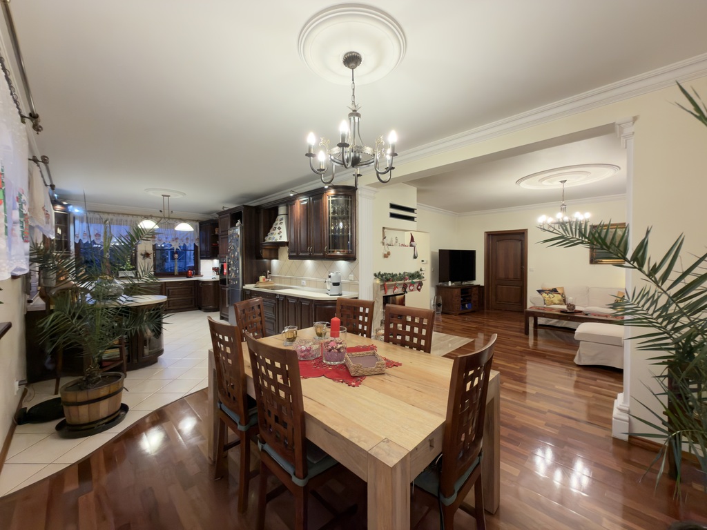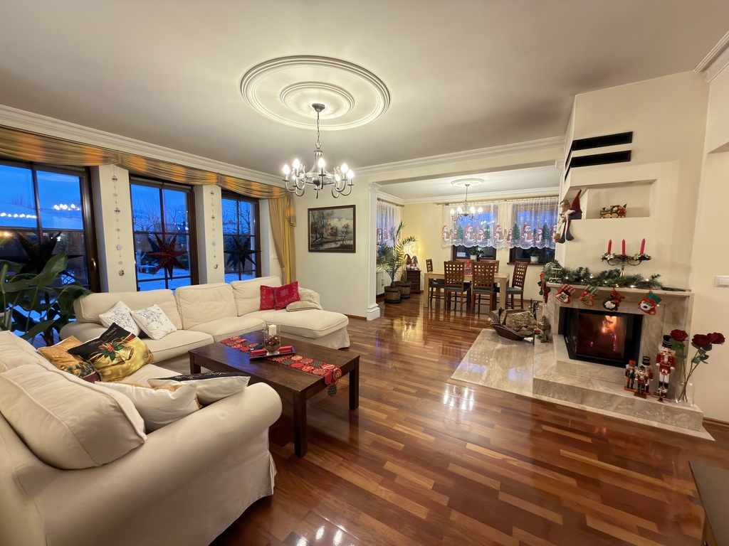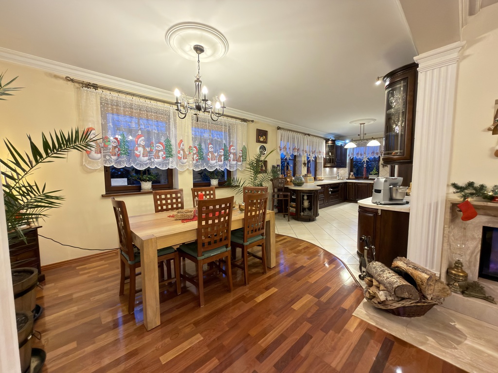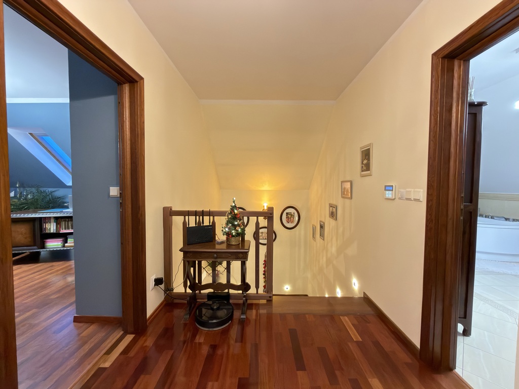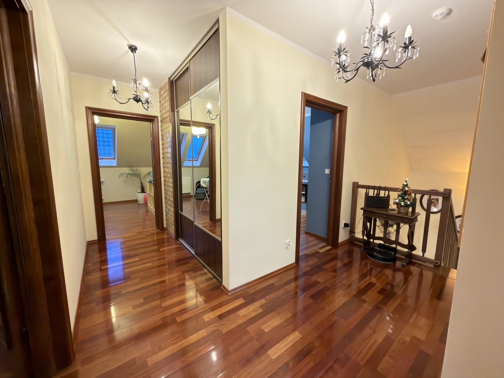 Nieruchomość wykończona jest porządnymi materiałami z dbałością o szczegóły, na podłogach parteru oraz w hallu na piętrze położone jest drewno egzotyczne, drewniana stolarka w całym domu, w kuchni i łazience ogrzewanie podłogowe.