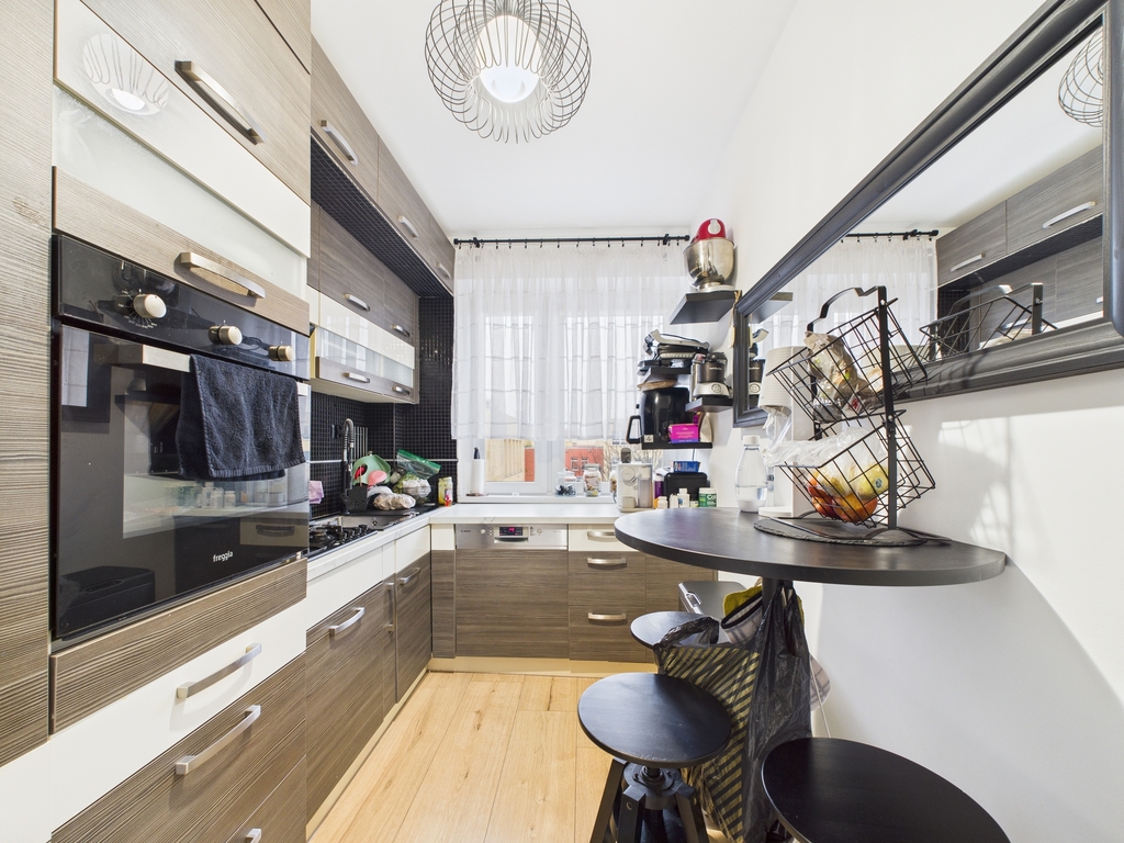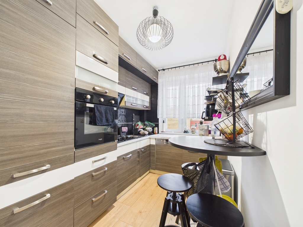 - Oddzielna i widna kuchnia z meblami oraz sprzętem AGD w zabudowie
