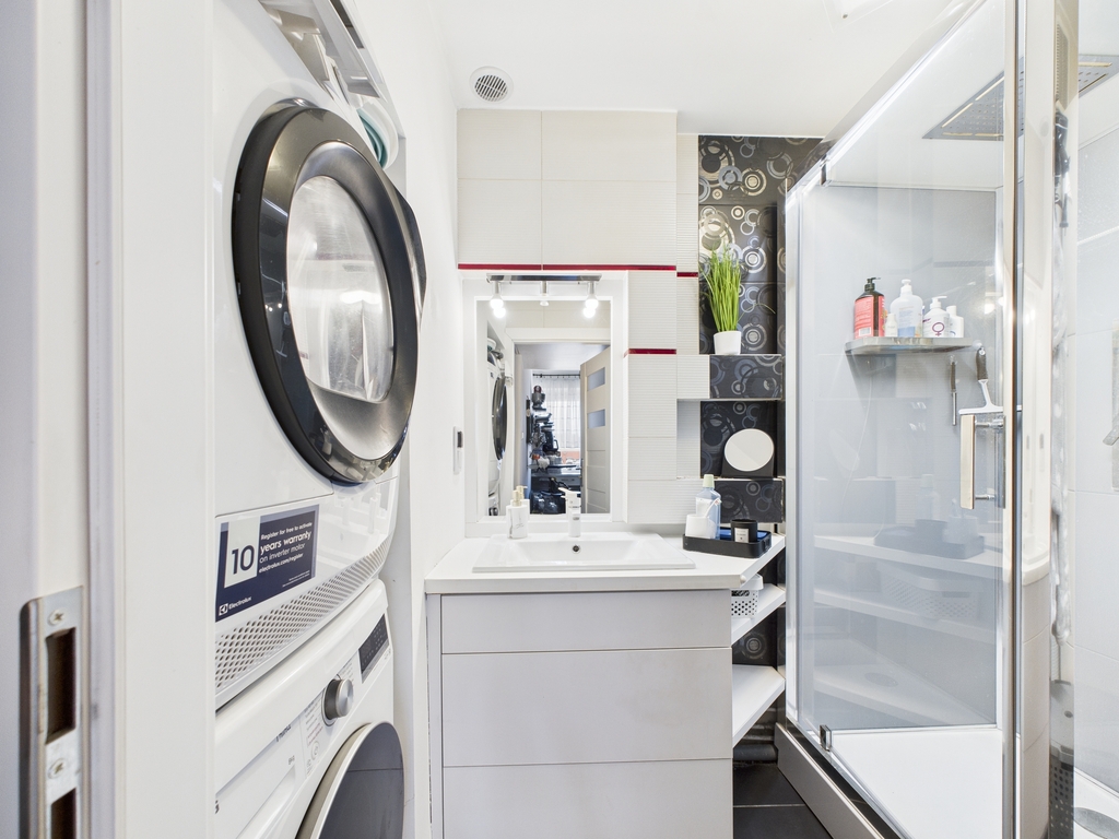 - Łazienka z kabiną prysznicową z hydromasażem, pralką oraz suszarką
