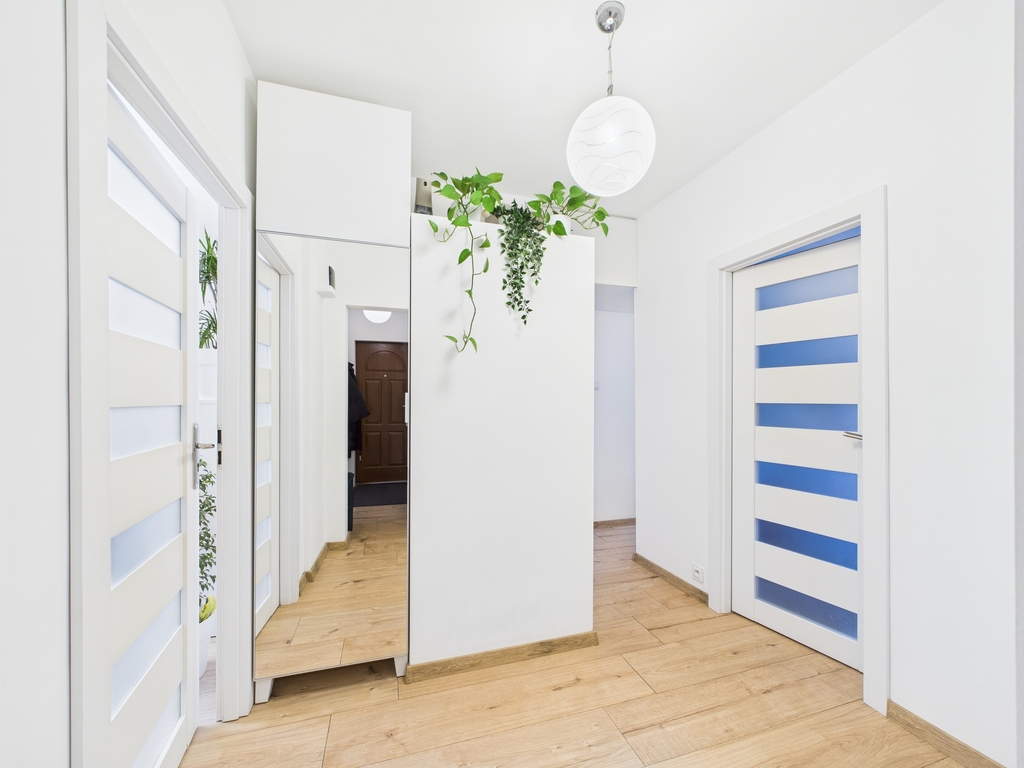 Bezprogowe panele wyłożone w całym mieszkaniu (oprócz łazienki i toalety).