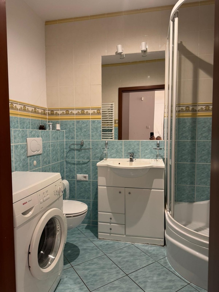 • łazienka z prysznicem, pralką oraz grzejnikiem drabinkowym