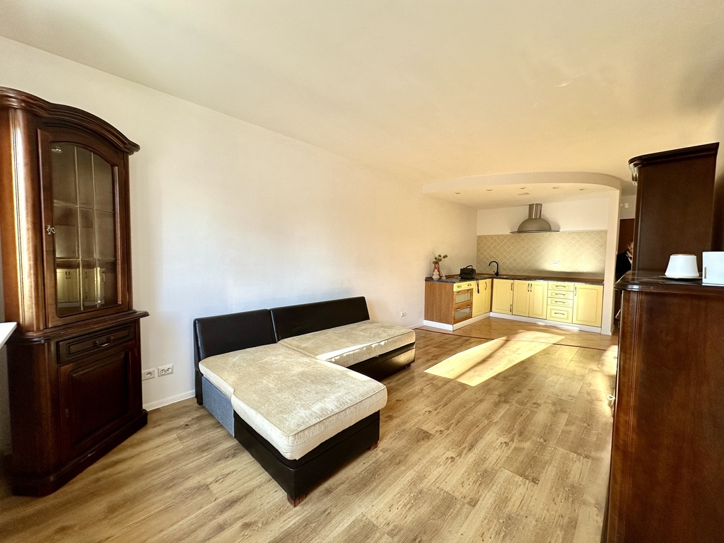 • salon z aneksem kuchennym w ciepłej, przytulnej kolorystyce