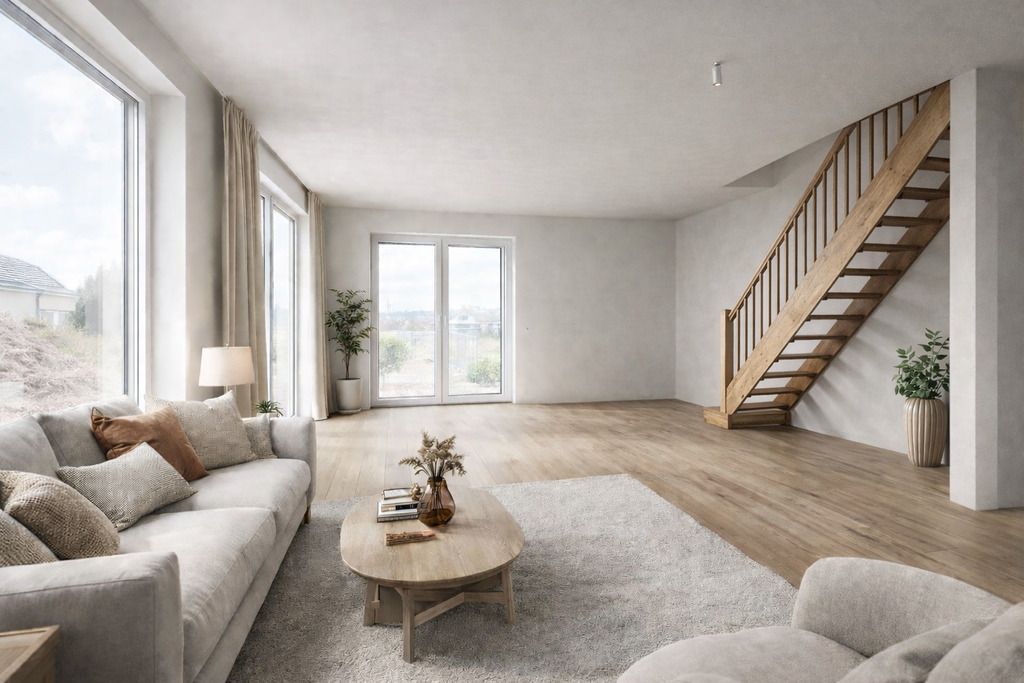 Parter:- przestronny salon z aneksem kuchennym – 38 m², z dużymi przeszkleniami i wyjściem na taras