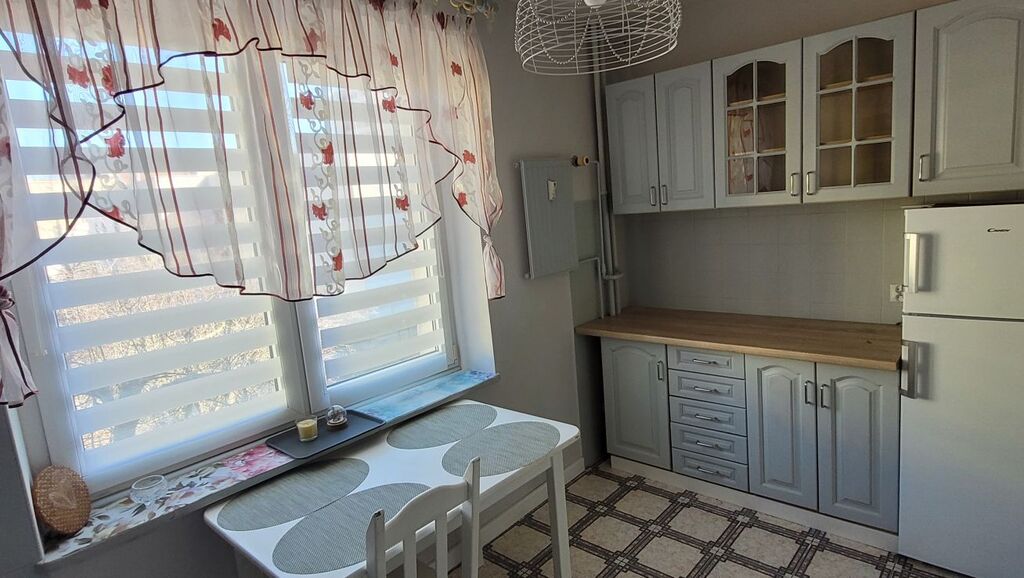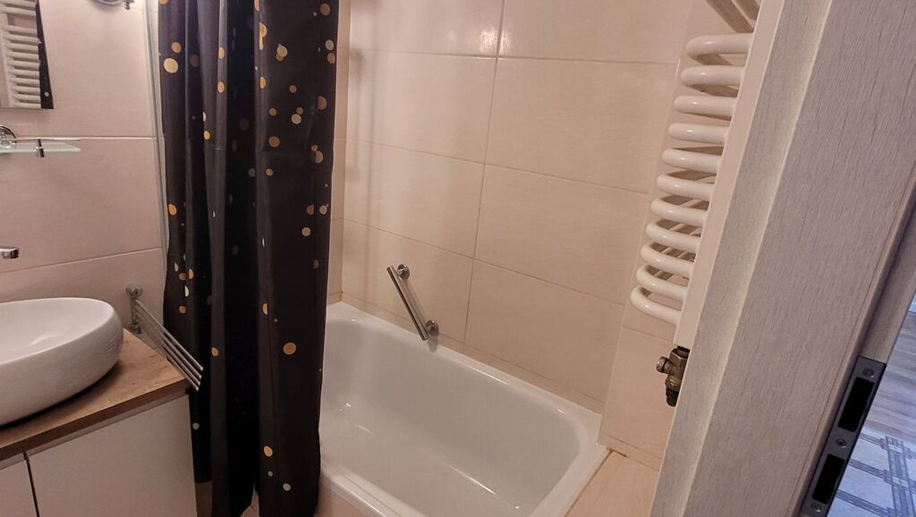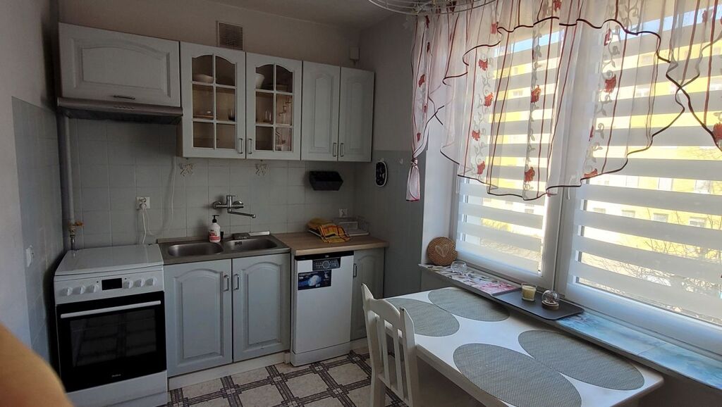 2 rozkładowe pokoje, oddzielna kuchnia z oknem (lodówka, zmywarka), łazienka z wanną w glazurze i terakocie, pralka.