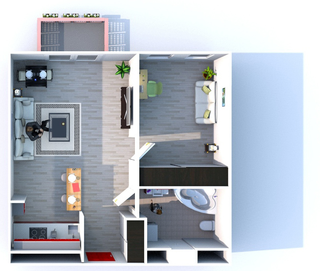 W mieszkaniu znajdują się: pokój dzienny z aneksem kuchennym i wyjściem na balkon, oddzielna sypialnia, łazienka z wc oraz przedpokój o łącznej powierzchni 41,73m2.