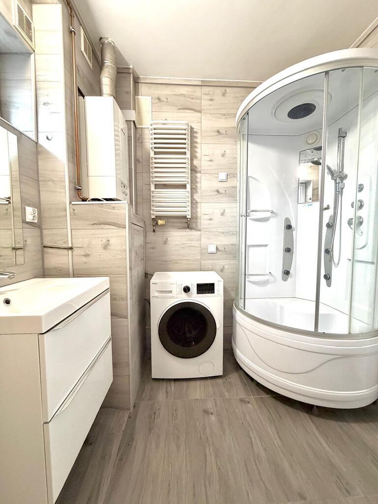 - łazienka z umywalką, WC i przeszkloną kabiną prysznicową,
