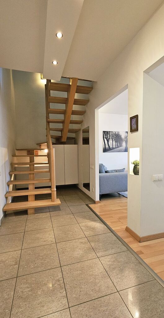 3 pokojowe mieszkanie dwupoziomowe, położone na 2 piętrze w budynku z windą, wybudowanym w 2002 r. przy Jasnych Błoniach. Na I poziomie salon (19m2) z aneksem kuchennym (12m2) i wyjściem na duży balkon od strony południowej. Pomiędzy salonem a kuchnią, pierwotnie ścianka działowa, aktualnie pozostawiona tylko w 1/3 części. W kuchni pełna zabudowa mebli wraz ze sprzętem agd (lodówka, zmywarka, płyta ceramiczna, piekarnik i mikrofalówka). Na tym poziomie znajduje się również małe wc (2m3) z zabudową szafek. Pod schodami zabudowa szafek. Na II poziom prowadzą schody drewniane. Na tym poziomie 2 sypialnie ze skosami (10 i 11 m2), w każdej sypialni pojemne garderoby. Łazienka (5m2) z wanną z jaccuzi, bidetem i wc, ogrzewanie podłogowe. We wnęce, zabudowa z miejscem na przedmioty gospodarcze i pralkę. W oknach połaciowych na II poziomie, zamontowane rolety zewnętrzne zaciemniające i wewnętrzne przeciwsłoneczne. W pokojach i przedpokoju na podłogach deska barlinecka, w kuchni i łazienkach gres szkliwiony w stanie idealnym. Koszty miesięczne to czynsz ok. 738 zł (przy zużyciu 8m3 wody), gaz - zaliczka co 2 m-ce 340 zł, plus prąd, tv i internet. Istnieje możliwość zakupu miejsca postojowego w garażowcu pod budynkiem za dodatkową opłatą 90 tys. zł (czynsz do zarządcy za miejsce postojowe 174 zł). Mieszkanie do odświeżenia, podłogi do przecyklinowania lub wymiany. Mieszkanie bardzo słoneczne (wszystkie okna od strony płd), idealne dla par lub rodzin z dziećmi. Cena do negocjacji, wydanie od ręki. Księga wieczysta bez obciążeń. Serdecznie polecam i zapraszam na prezentacje! Klucze w biurze. Przy podpisaniu umowy sprzedaży, opłata do biura nieruchomości.