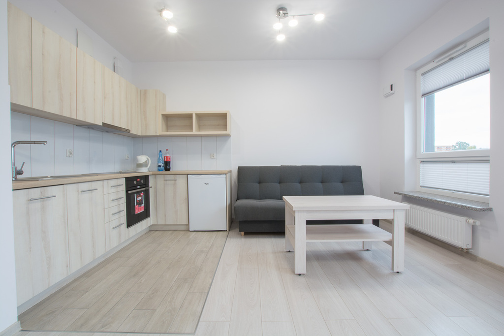 - Pełne wyposażenie: W cenie otrzymujesz meble kuchenne ze sprzętem AGD (zmywarka, lodówka, kuchenka), pralkę oraz meble w pokoju (wypoczynek, fotele, stolik).