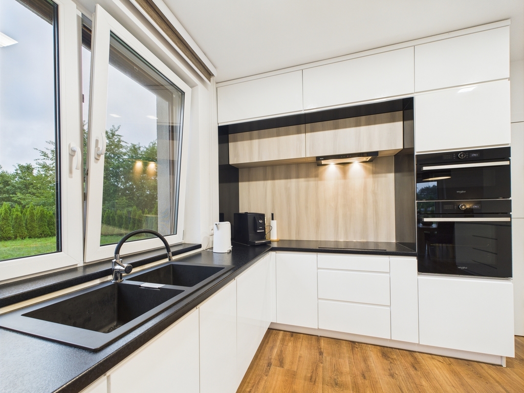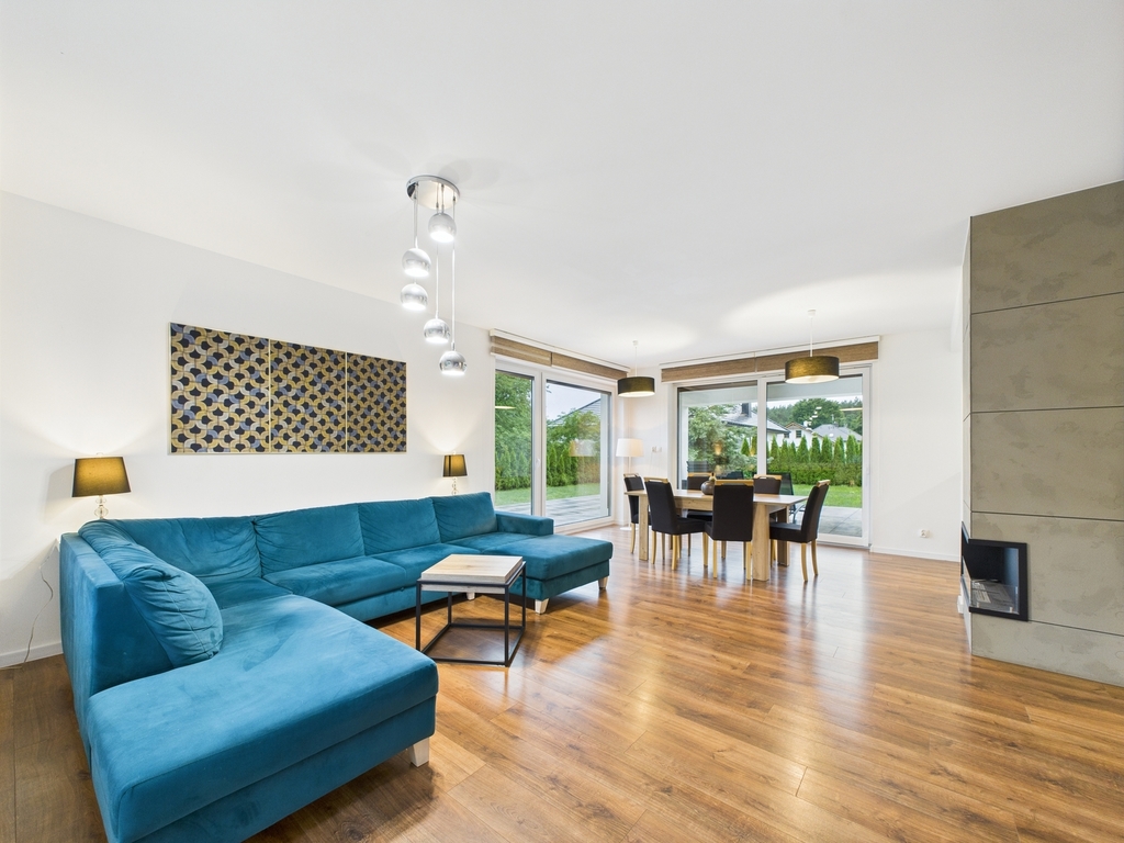 - elegancki i przestronny salon z bio kominkiem, dużymi panoramicznymi oknami wyjściem na taras oraz ogród