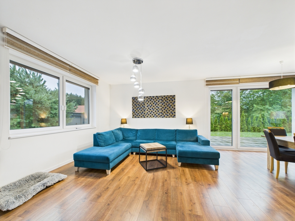 Dom wybudowany w 2019 r. na działce o powierzchni 1124 m² w kameralnej i cichej okolicy tuż obok lasu.