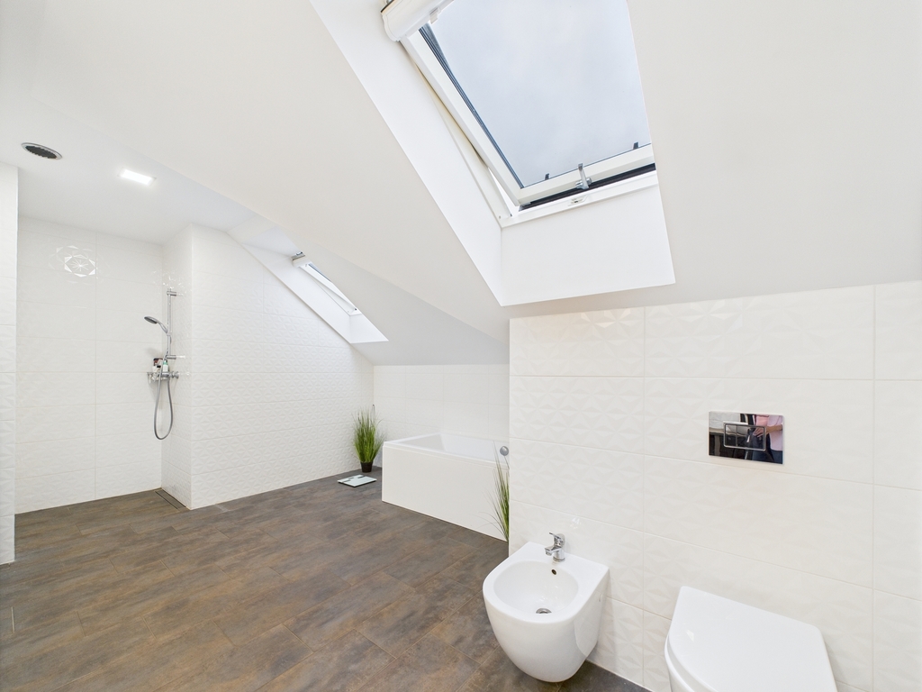 - łazienka z WC, prysznicem, wanną i oknem (9,78 m²)