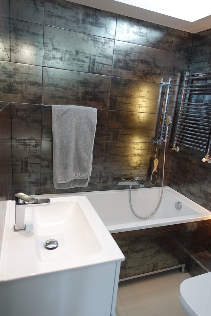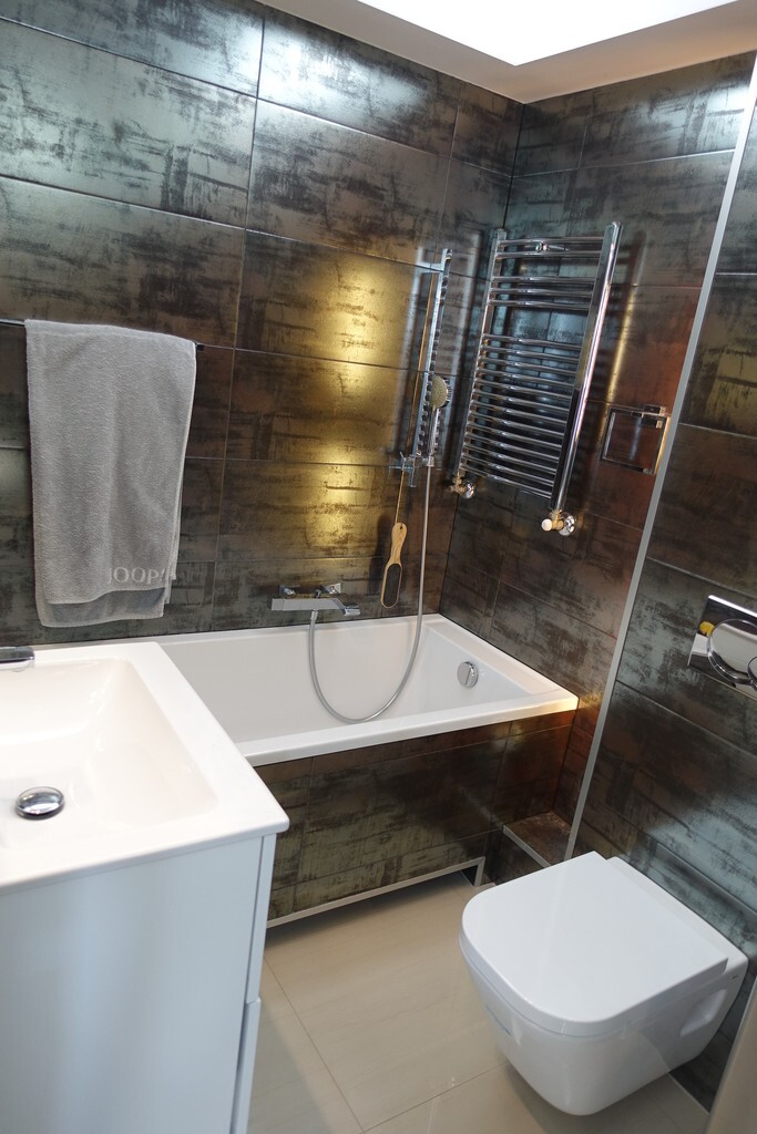 Łazienka w glazurze i terakocie z wanną, wc, umywalką.