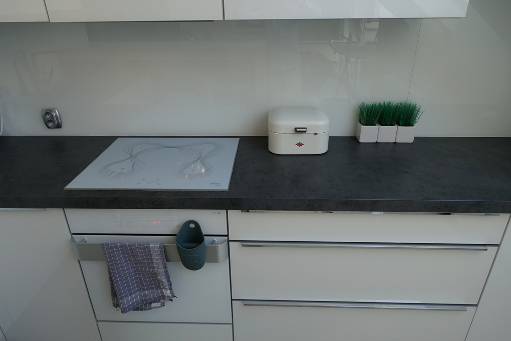 I POZIOM: salon (wyjście na taras) z aneksem kuchennym z zabudową meblową na wymiar oraz sprzętem AGD (lodówka, płyta indukcyjna, piekarnik, zlewozmywak, pochłaniacz).