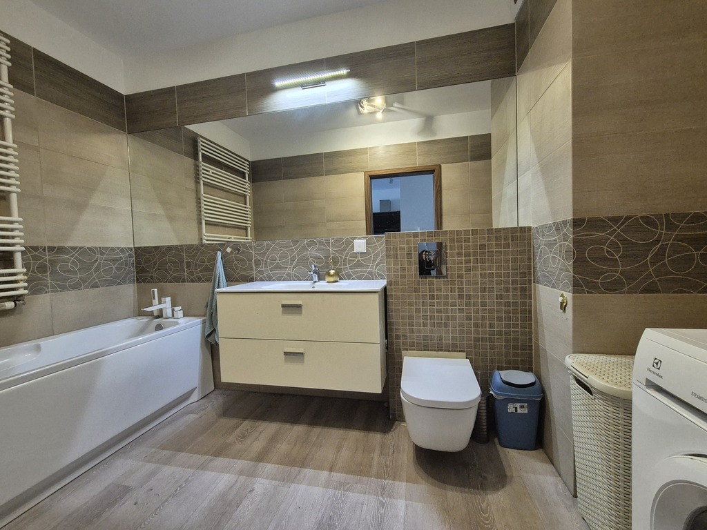 Łazienka ładnie wykończona, wyposażona w wannę, wc, umywalkę. W korytarzu dwie pojemne szafy w zabudowie.