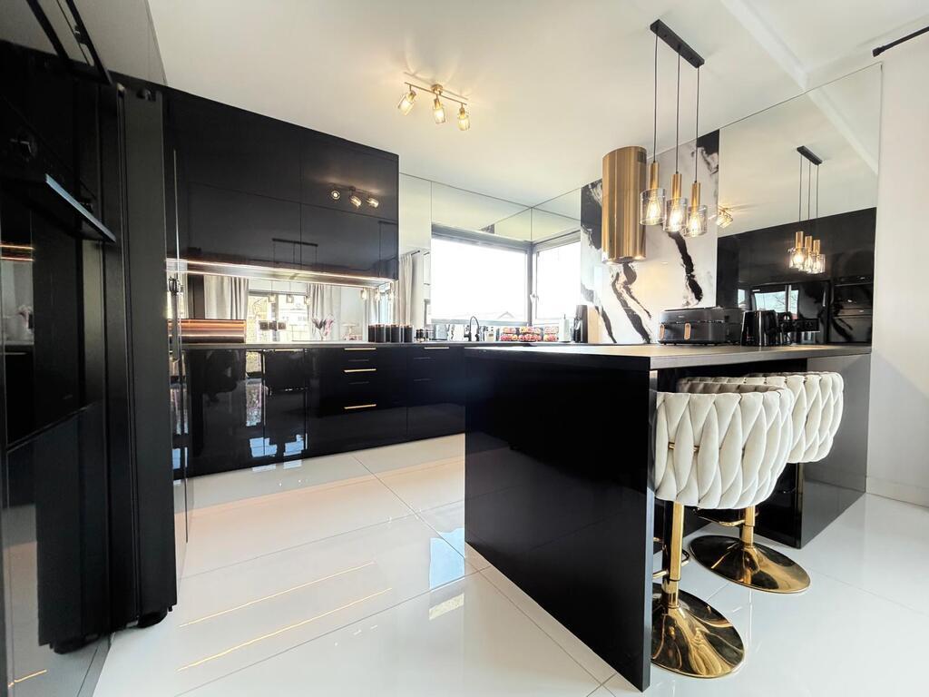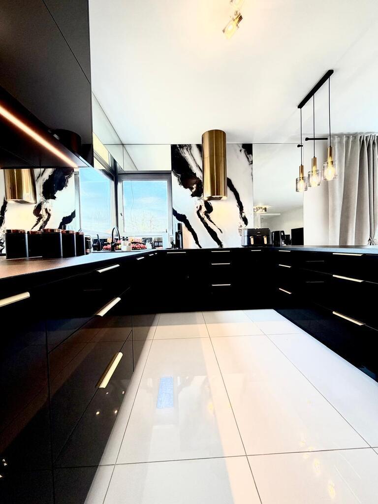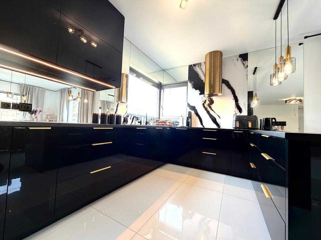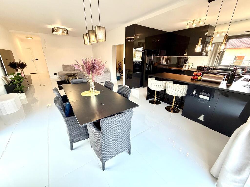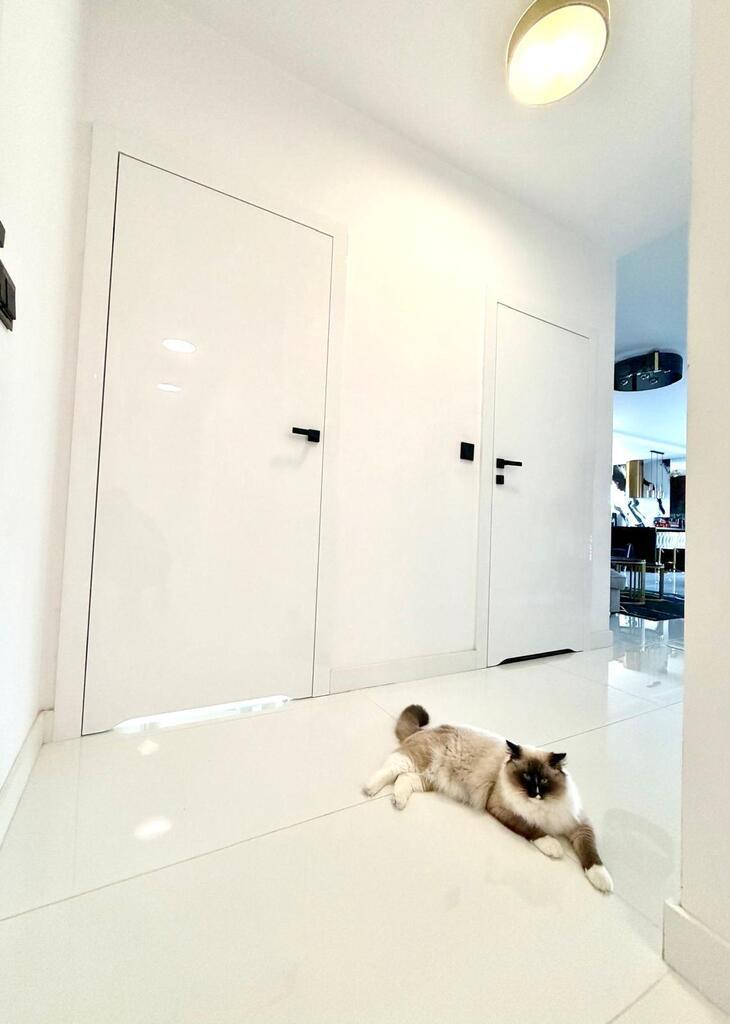Rozbudowana stolarka wewnętrzna w postaci zabudowy kuchennej, zabudowy szaf w sypialni, garderobie i korytarzu.