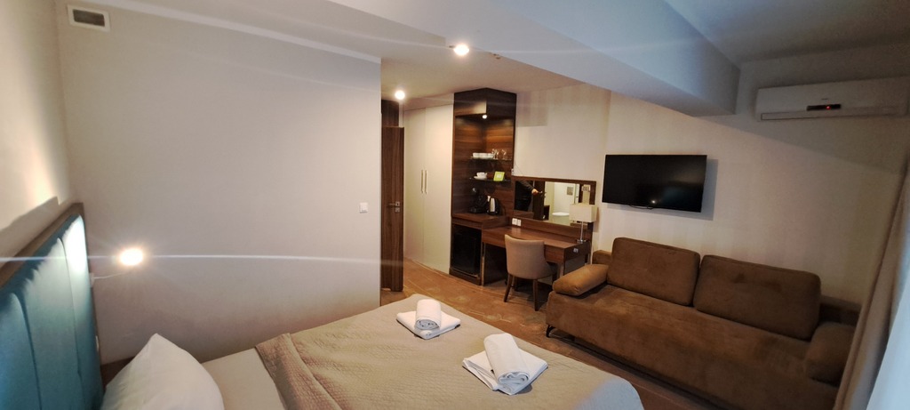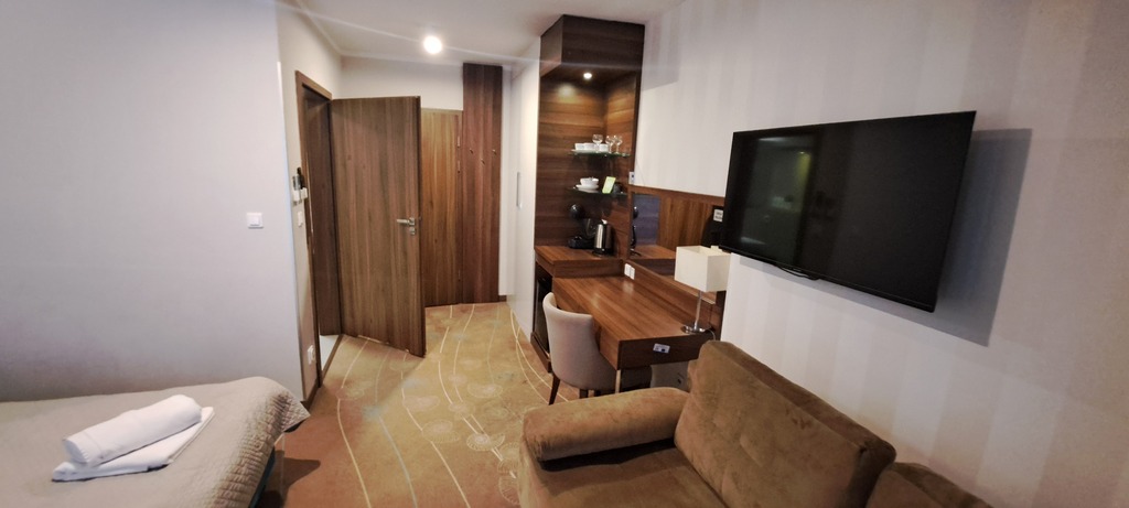 - pokój z podwójnym łóżkiem, szafą garderobianą oraz wygodnym miejscem do siedzenia z ekspresem do kawy,