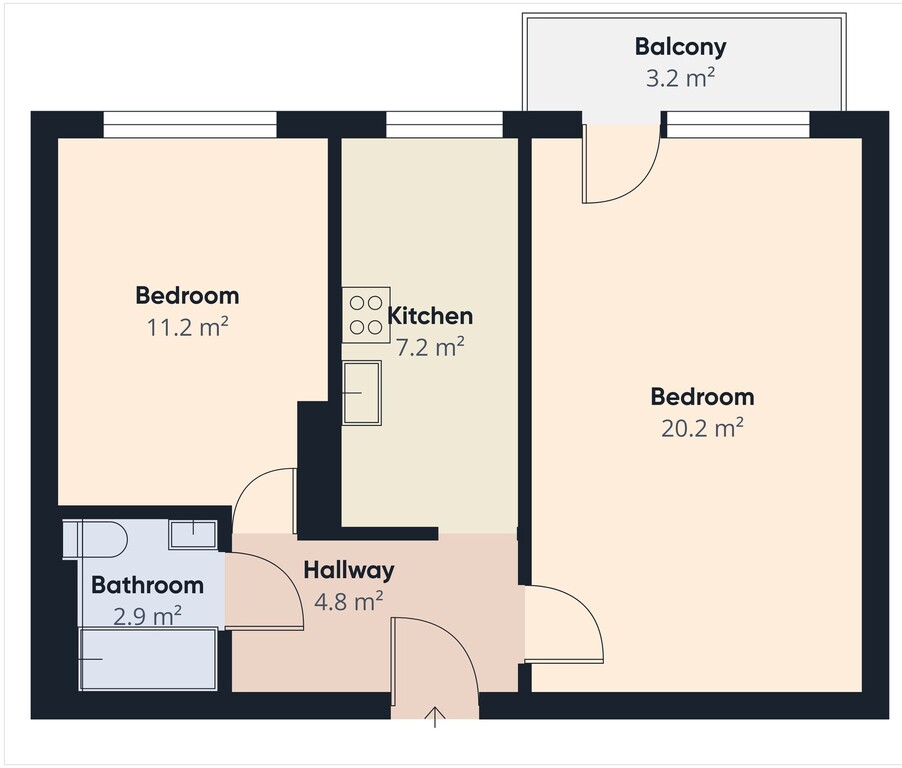Zgodnie z aktem notarialnym lokal mieszkalny składa się z dwóch pokoi, kuchni, łazienki i przedpokoju o powierzchni użytkowej 45,3 m2 oraz pomieszczenia przynależnego – piwnicy o powierzchni 2,31 m2.